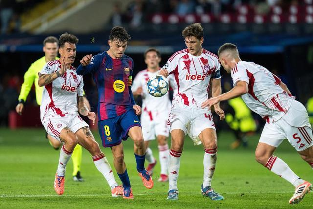 十月二十一日,巴塞罗那球员佩德里(左二)在比赛中进攻。当天,西甲巴塞罗那主场6-1击败希腊奥林匹亚科斯,2025-2026赛季欧冠第三轮。新华社(胡安·戈萨摄)