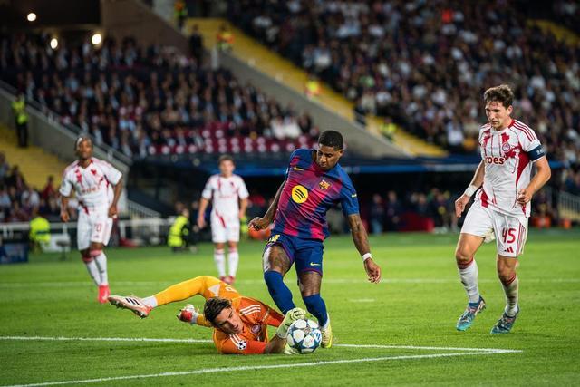 十月二十一日,巴塞罗那球员拉什福德(右二)在比赛中与奥林匹亚科斯门将佐拉基斯作战。新华社(胡安·戈萨摄)