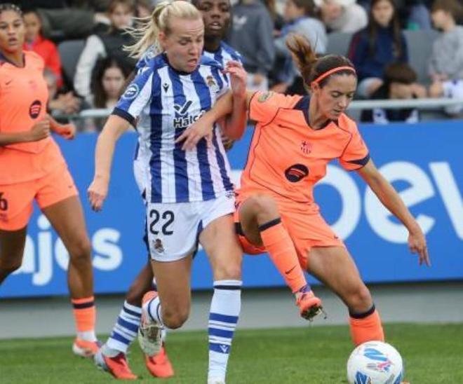 比赛中的两个重大惩罚都不利于巴萨女足。首先是裁判判给皇家社会女足的点球:亚历山德里在禁区内被认定为手球,但从回放的角度来看,球更像是反弹到她的肩膀上,这个惩罚太严厉了。