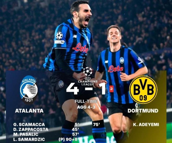 北京时间2月26日,亚特兰大在冠军联赛淘汰赛第二轮比赛中以0-2输掉第一轮比赛,最终依靠斯卡马卡、扎帕科斯塔和帕萨利奇的进球。此外,萨马尔季奇以4-1击败多特蒙德,两轮总比分以4-3逆转晋级。