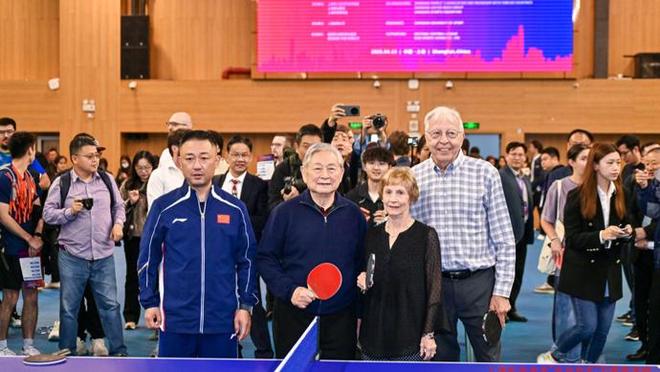 同一天,在上海体育大学体育场,徐寅生和康妮·斯威里斯在现场进行了混合双打比赛。曾经一起经历过破冰之旅的中美运动员现在又在乒乓球桌前相遇了。这个曾经年轻的女孩和年轻人转眼间就变成了一个古老的老人,但他仍然玩得很开心。徐寅生说:“体育是一种共同的语言。在半个多世纪的多次互访中,我们的友谊是永恒的。”。
